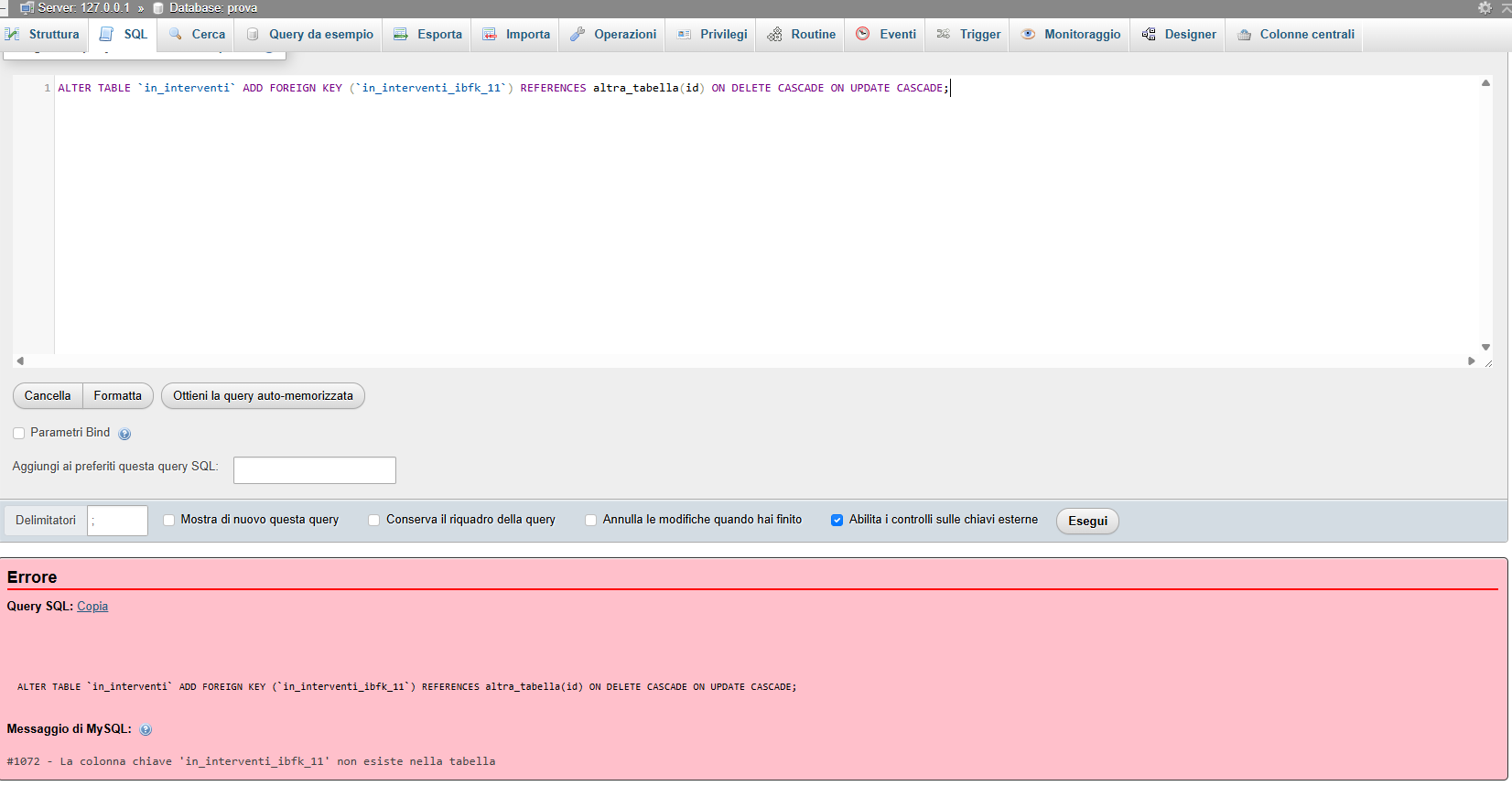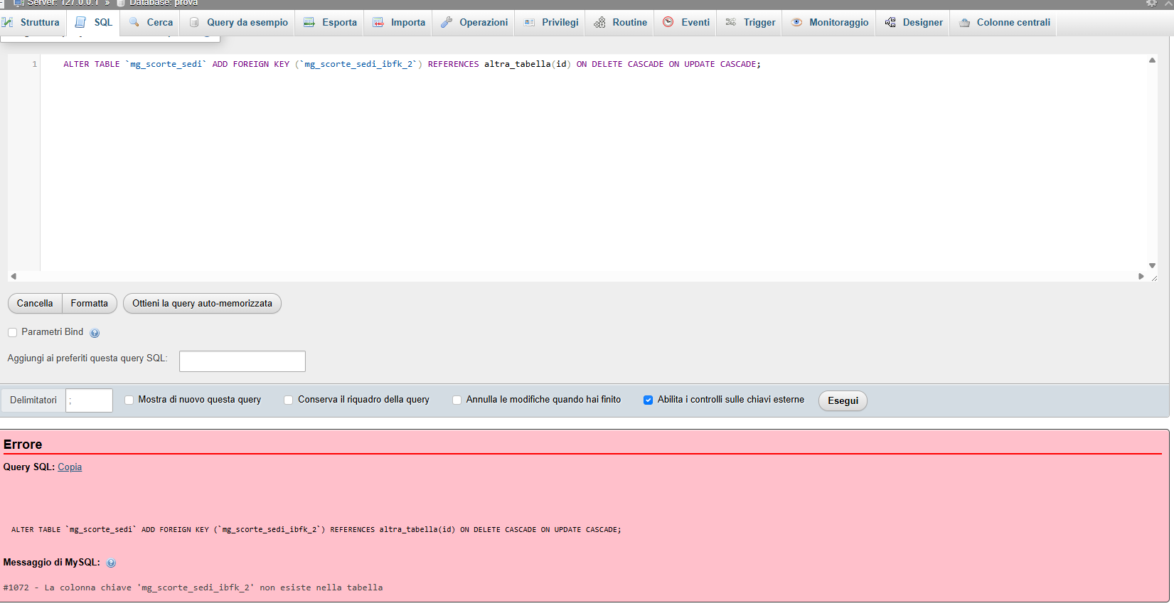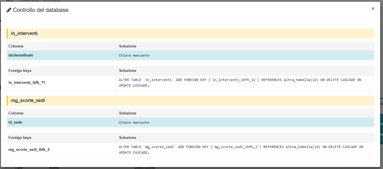 Valentina Buongiorno loris.calvi, va rimossa la chiave in_interventi_ibfk_11 presente nella tabella in_interventi, e la chiave da idclientefinale. Analogamente per la tabella mg_scorte_sedi, vanno rimosse la chiave mg_scorte_sedi_ibfk_2 e la chiave id_sede. Potete procedere a fare questo manualmente da database